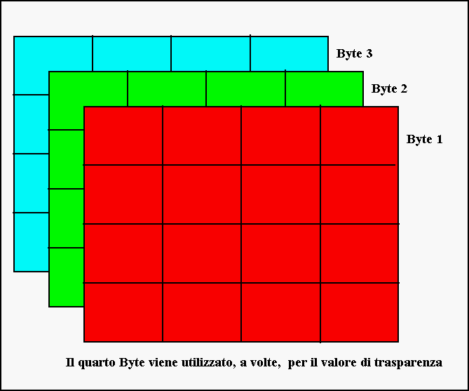 Il file contiene esplicitamente, per ogni pixel dell'immagine, l'indicazione delle quantita' di Rosso, Verde, Giallo del pixel stesso. Si possono rappresentare fino a 256 tonalita' del colore base (o tonalita' di grigio).