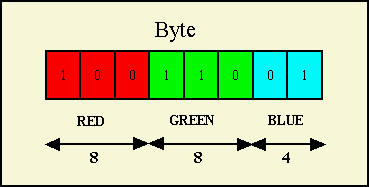 Ogni byte del file indica un "numero di colore" del pixel corrispondente, ma la corrispondenza tra "numero di colore" ed effettivo colore in RGB e' risolto attraverso una tabella (pallete) che e' specifica per ogni immagine e deve essere contenuta nel file grafico. In questo modo si possono utilizzare su una singola immagine fino a 256 colori scelti tra 16.8 Milioni di colori. (ad esempio 256 tonalita' del rosso o di grigio)